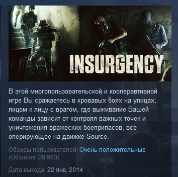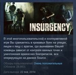 В этой многопользовательской и кооперавтивной игре Вы сражаетесь в кровавых боях на улицах, лицом к лицу с врагом, где выживание Вашей команды зависит от контроля важных точек и уничтожения вражеских боеприпасов, все оперирующее на движке Source. Insurgency — наследник высоко оцененного одноименного мода на движке Source, высококонкурентный и беспощадный, подчеркивающий равность всех игроков.